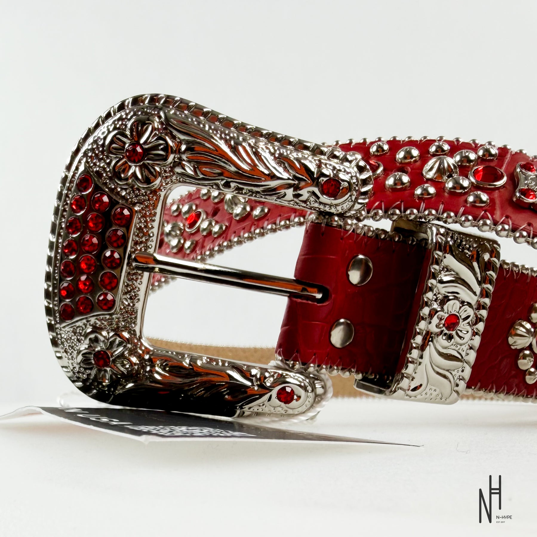 B.B. Simon The Trojan Red Belt to luksusowy pasek stworzony z myślą o osobach, które cenią ekstrawagancki styl i perfekcyjne rzemiosło. Wykonany ręcznie w Kalifornii, wyróżnia się intensywnym czerwonym kolorem, błyszczącymi kryształami Swarovski oraz masywną, zdobioną klamrą – znakiem rozpoznawczym marki B.B. Simon.