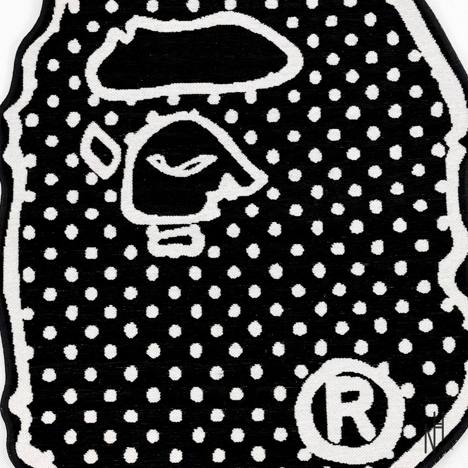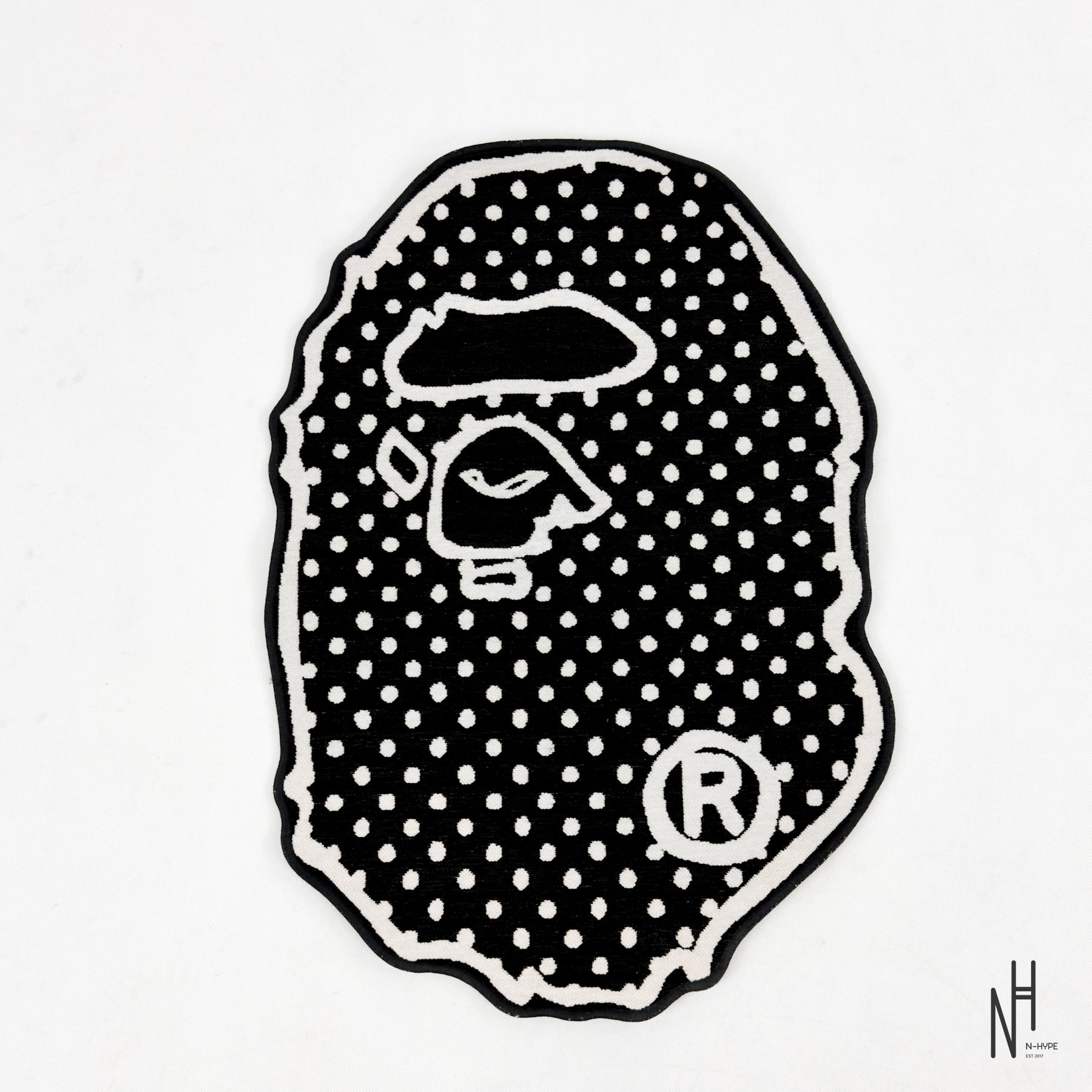Design: The classic BAPE monkey head has been redrawn with thick black and white lines, mimicking marker strokes. This makes the rug look like a two-dimensional sticker on the floor or a hole in reality.