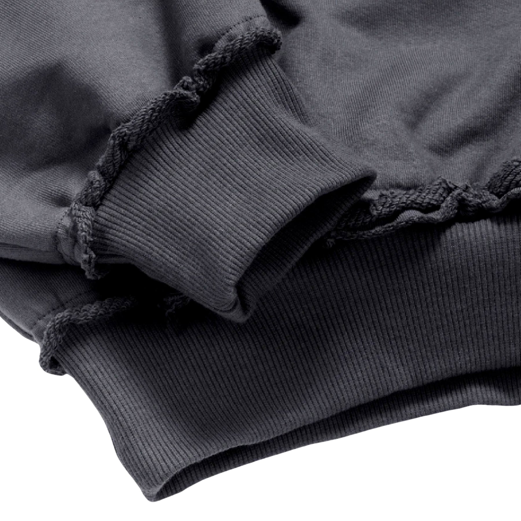 - Details: distinctive raw edge finish at the lower cuffs, emphasizing the unique character.