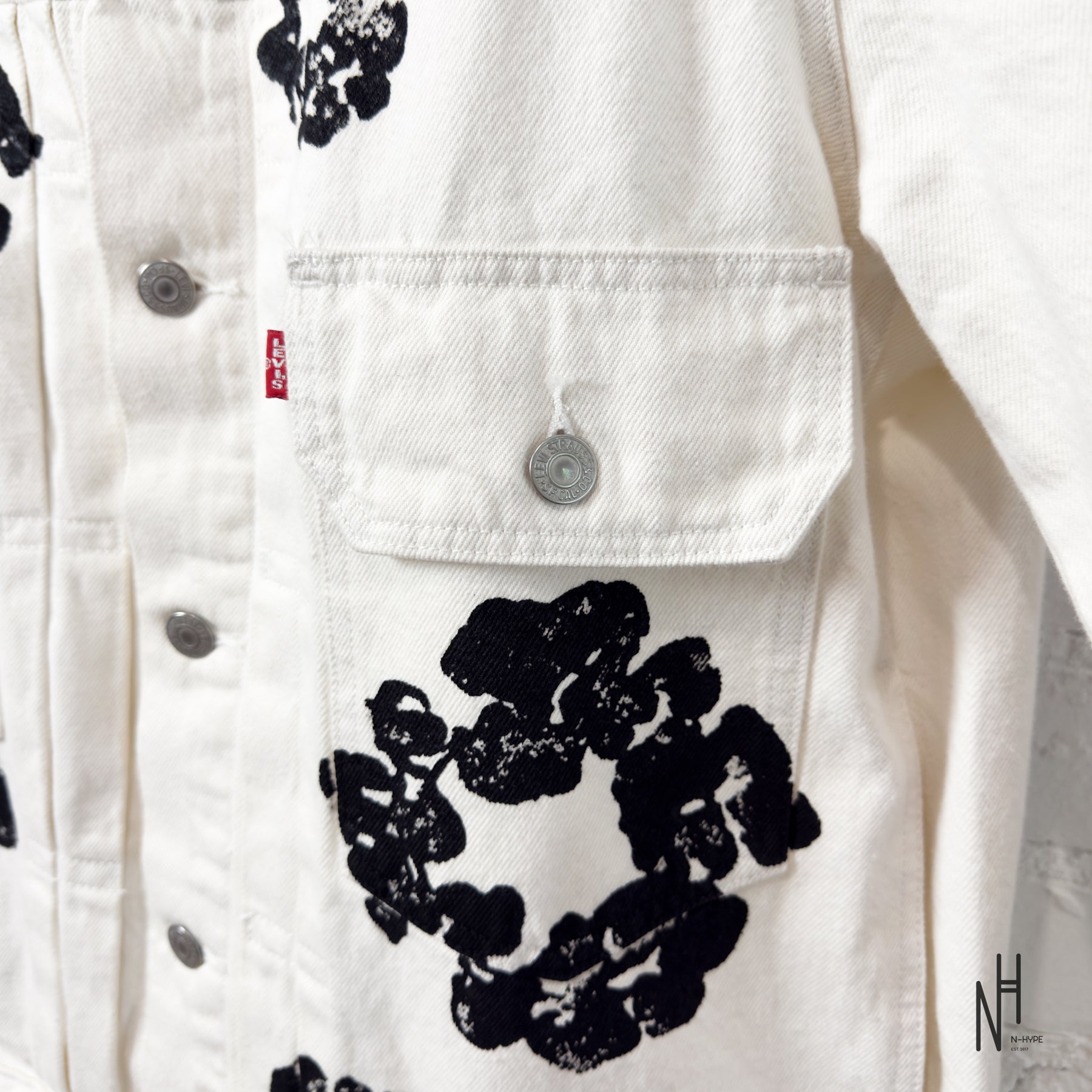 Denim Tears x Levi’s Jacket / White to wyjątkowa kurtka jeansowa powstała we współpracy kultowej marki Levi’s z Denim Tears. Biała baza ozdobiona została charakterystycznym motywem bawełnianych wieńców, który nadaje jej artystycznego i kolekcjonerskiego charakteru.