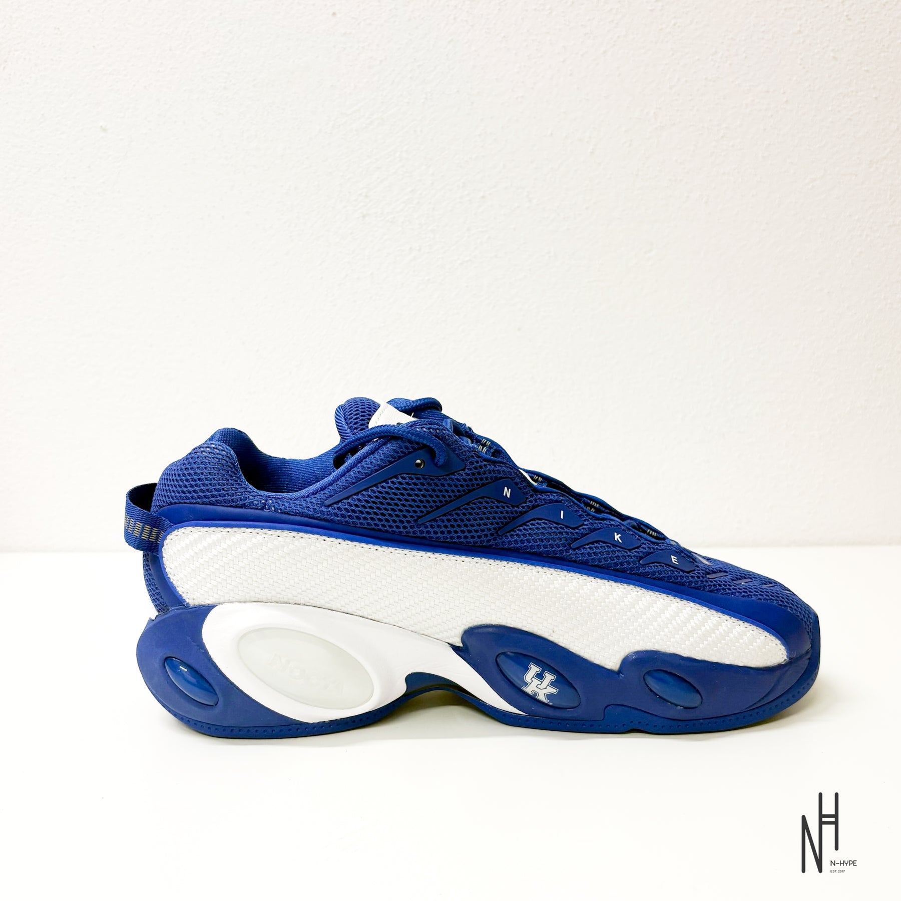 Cholewka i Design: Oddychająca, pleciona siateczka połączona z trwałymi nakładkami w barwach uniwersytetu Kentucky (głęboki błękit i biel). Charakterystyczne "bug eyes" (chromowane wstawki na podeszwie) to bezpośrednie nawiązanie do designu lat 90.